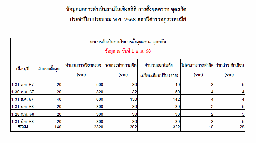 มี.ค.68ข้อมูลผลการดำเนินการในเชิงสถิติ การตั้งจุดตรวจ จุดสกัด ประจำปีงบประมาณ 2568 ของ สภ.เทนมีย์ ข้อมูล ณ วันที่ 1 เม.ย. 2568