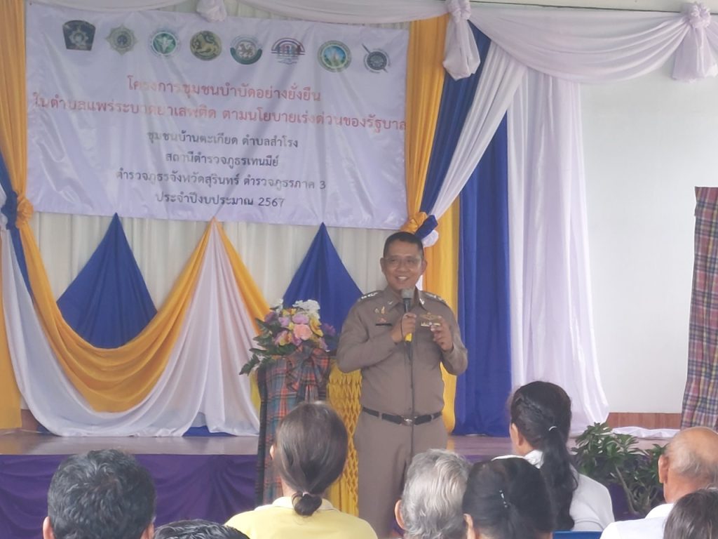 วันที่10 มิ.ย.2567 เวลา 11.00 น. นายสมชัย บูรณะ นายอำเภอเมืองสุรินทร์ ได้เดินทางมาเป็นประธานในพิธีเปิดและบันทึกลงนามข้อตกลง ตามโครงการชุมชนบำบัดอย่างยั่งยืนในพื้นที่แพร่ระบาดยาเสพติดตามนโยบายเร่งด่วนของรัฐบาล ณ ศาลาประชาคมบ้านตะเกียต ม.8 ต.สำโรง อ.เมือง จ.สุรินทร์ โดยมี พ.ต.อ.นคร ภู่รัตน์ ผกก.สภ.เทนมีย์ , นามานะ พิศวง นายก อบต.สำโรง , นายทรงศักดิ์ เที่ยงตรง ผู้ใหญ่บ้านตะเกียต และหัวหน้าส่วนราชการ ผู้นำชุมชนในเขตตำบลสำโรง คณะกรรมการหมู่บ้าน/อบต. /อสม. และ กต.ตร.สภ.เทนมีย์ ร่วมเป็นเกียรติในพิธีเปิดดังกล่าวด้วย