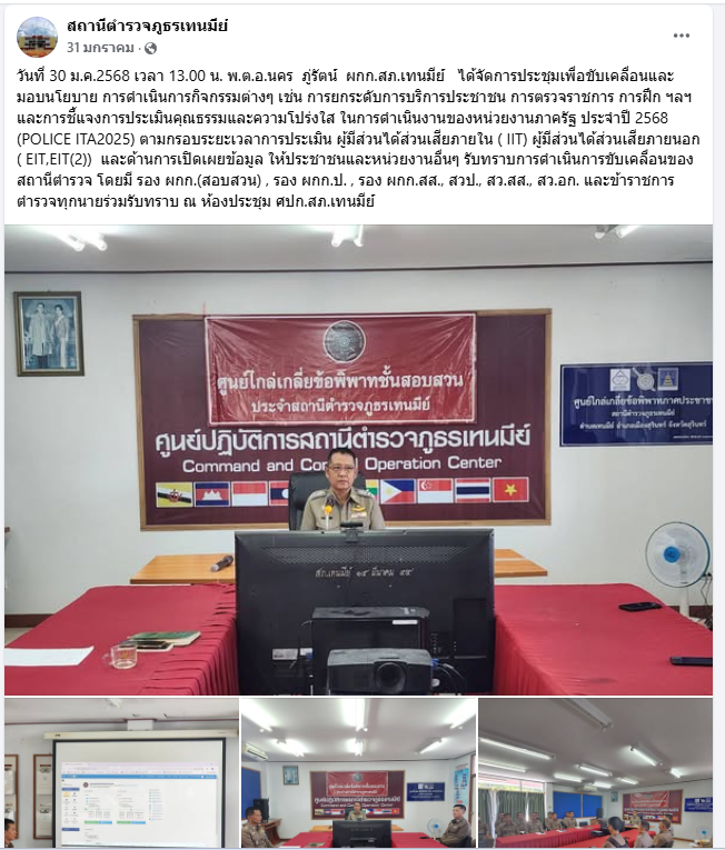 วันที่ 30 ม.ค. 2568 เวลา 13.00 น. พ.ต.อ.นคร ภู่รัตน์ ผกก.สภ.เทนมีย์ ได้จัดการประชุมเพื่อขับเคลื่อนและมอบนโยบาย การดำเนินการกิจกรรมต่างๆ เช่นการยกระดับการบริการประชาชน การตรวจราชการ การฝึก ฯลฯ และการชี้แจงการประเมินคุณธรรมและความโปร่งใส ในการดำเนินงานของหน่วยงานภาครัฐ ประจำปี 2568 (POLICE ITA2025) ตามกรอบระยะเวลาการประเมิน ผู้มีส่วนได้ส่วนเสียภายใน ( IIT) ผู้มีส่วนได้ส่วนเสียภายนอก ( EIT,EIT(2)) และด้านการเปิดเผยข้อมูล ให้ประชาชนและหน่วยงานอื่นๆ รับทราบ การดำเนินการขับเคลื่อนของสถานีตำรวจ โดยมี รอง ผกก.(สอบสวน) , รอง ผกก.ป. , รอง ผกก.สส., สวป., สว.สส., สว.อก. และข้าราชการตำรวจทุกนายร่วมรับทราบ ณ ห้องประชุม ศปก.สภ.เทนมีย์
