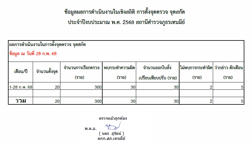 ข้อมูลผลการดำเนินงานเชิงสถิติในการตั้งจุดตรวจ จุดสกัด ประจำเดือน ก.พ. 2568
