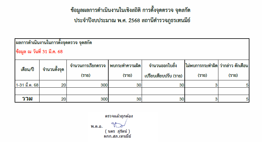 ข้อมูลผลการดำเนินงานเชิงสถิติในการตั้งจุดตรวจ จุดสกัด ประจำเดือน มี.ค. 2568